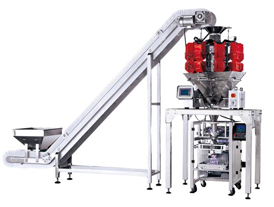 系統組成部分:L型上料機、8斗電腦組合秤、操作平臺、自動包裝機、上料機